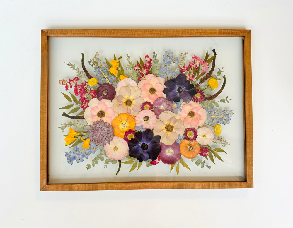 We frame your flowers with UV-protectant glass in our custom frames, package them securely, and ship them to your home, ready to shine! You can also come pick your frame up from our studio, if you are local!
