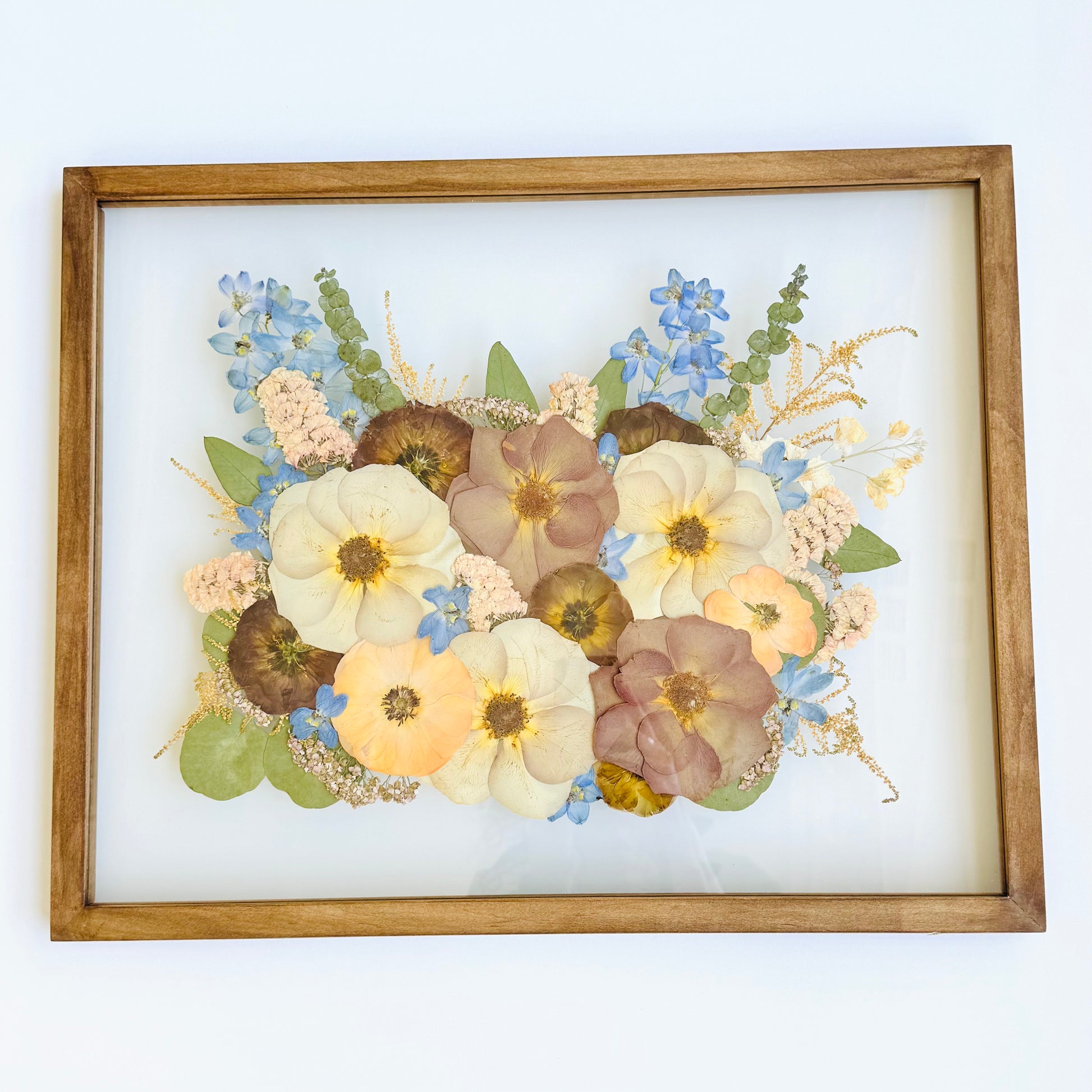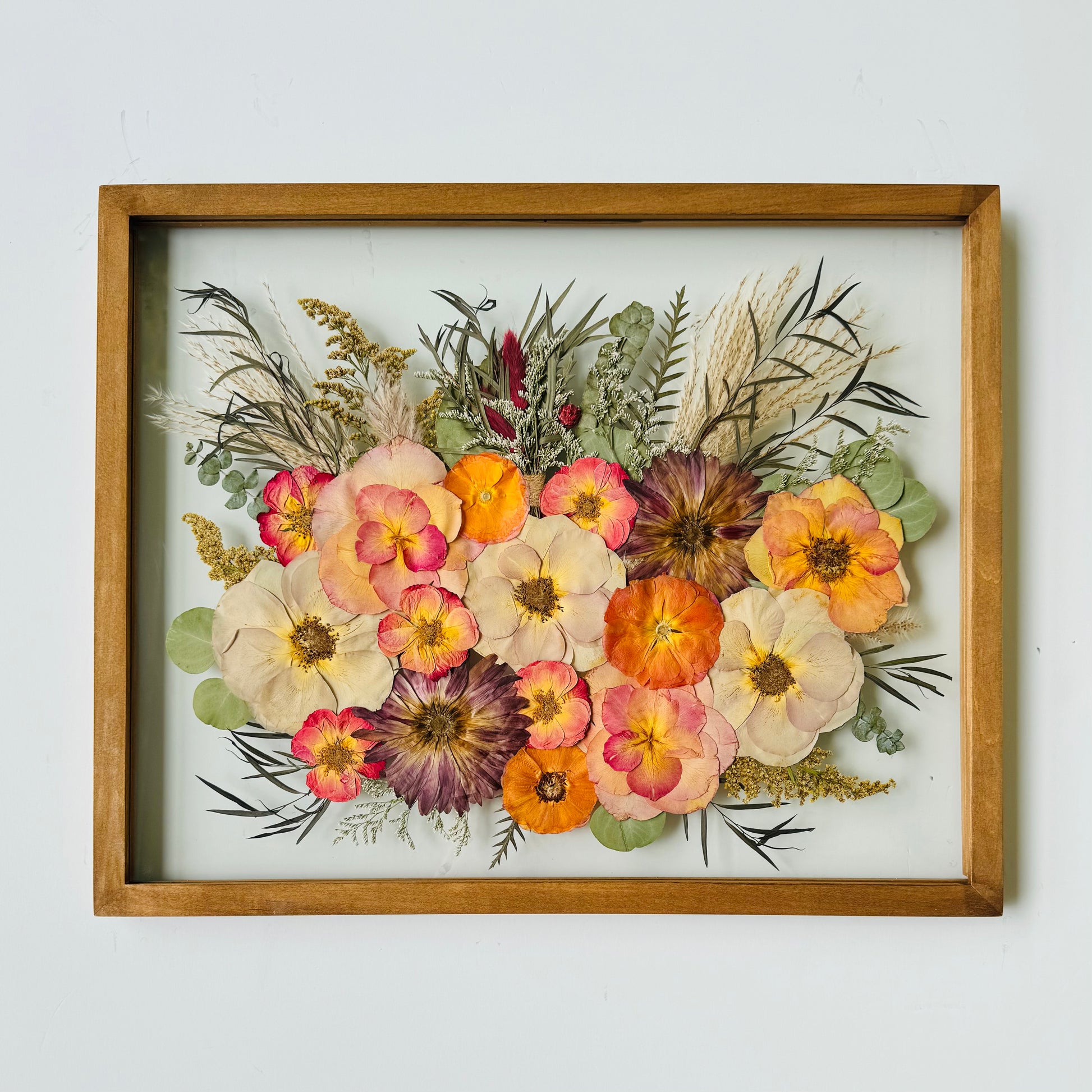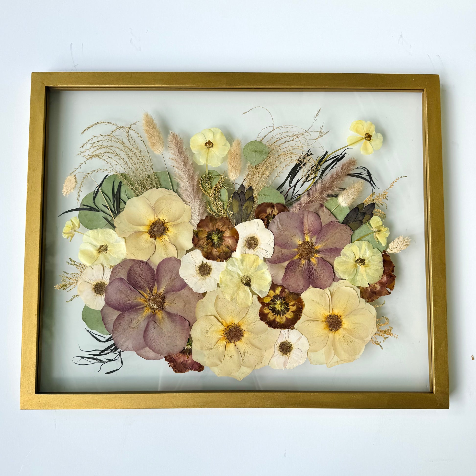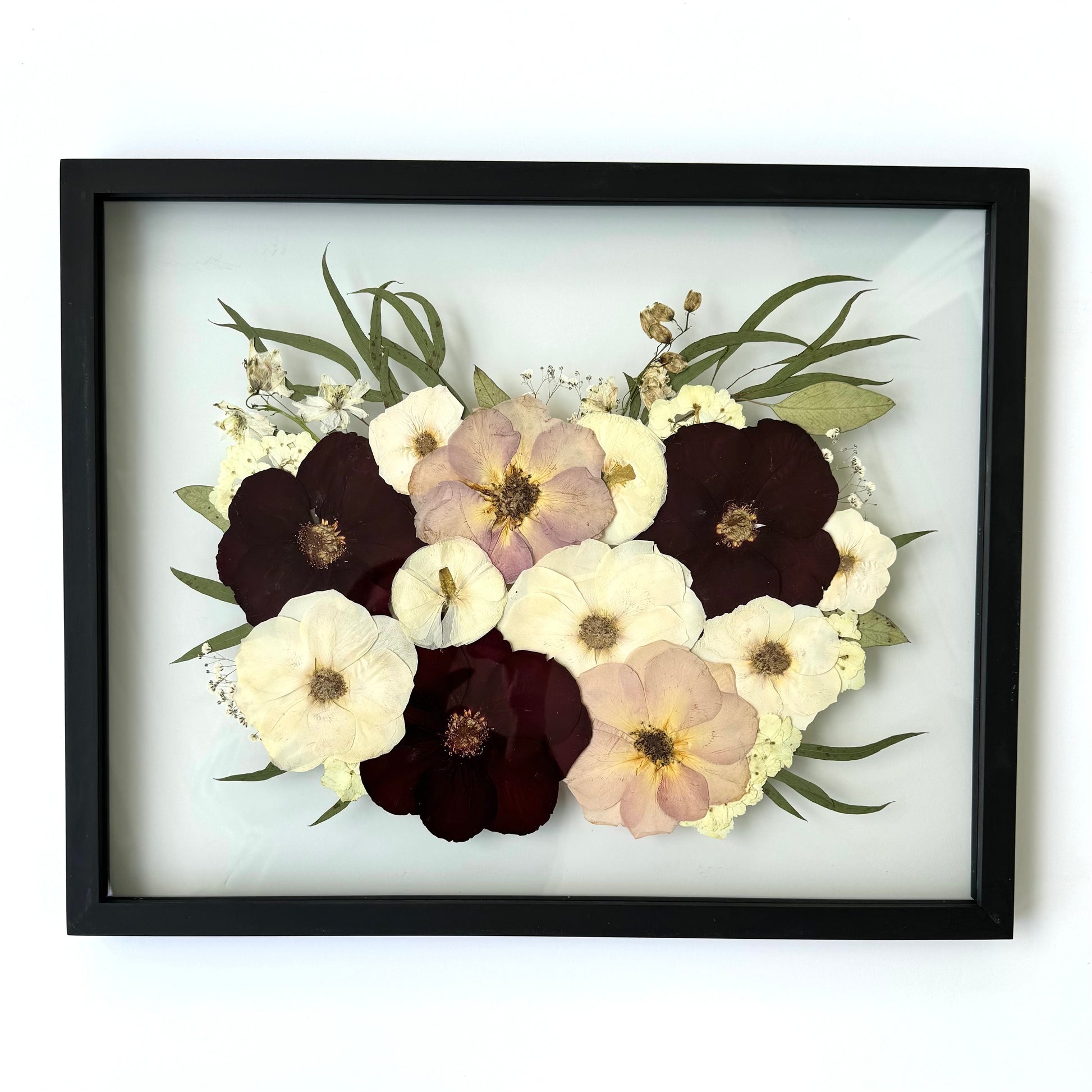 It's completely normal for flowers to change color during the preservation process - white blooms might turn creamy or yellow, and vibrant reds may mellow into purples. We do color-correct white flowers when necessary. This transformation is part of their natural aging process and gives each preserved piece a unique character. We embrace these changes as a testament to nature's unpredictable charm! You will receive a mock-up design for approval and be given the chance to make any adjustments before your frame is finalized.