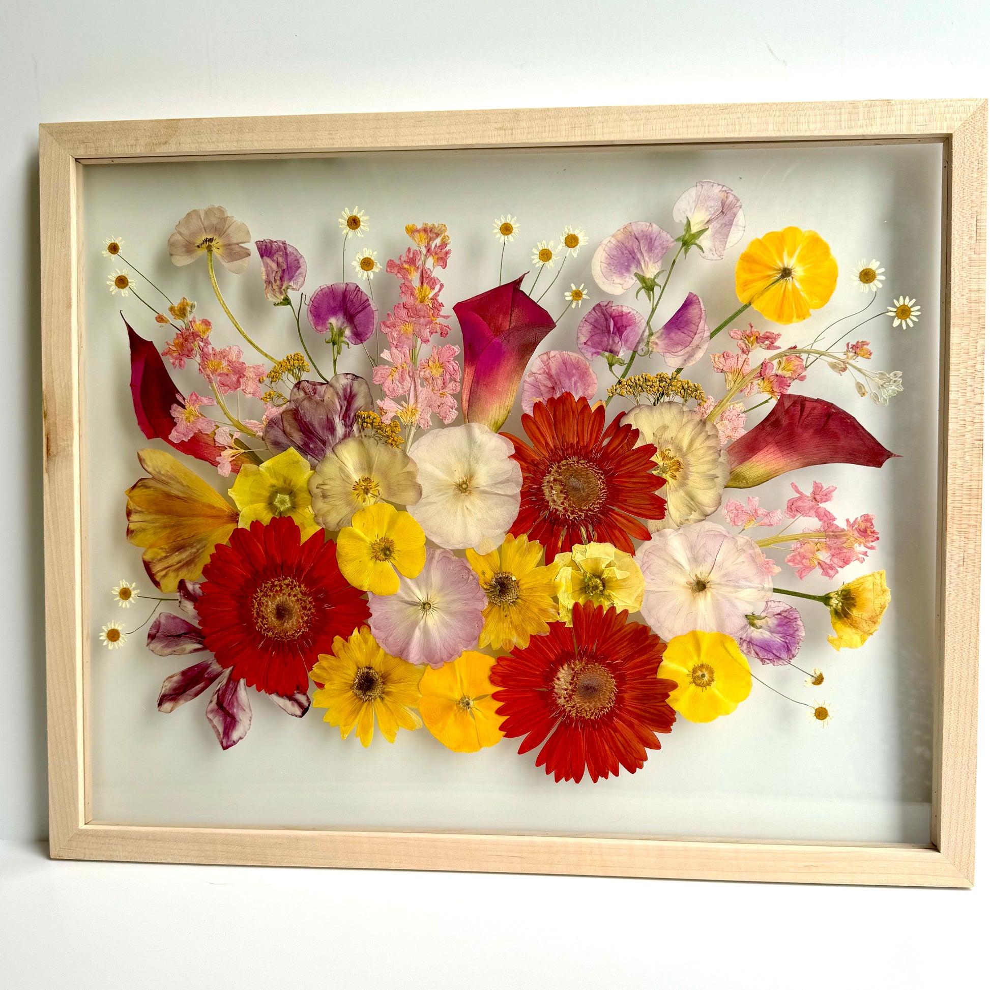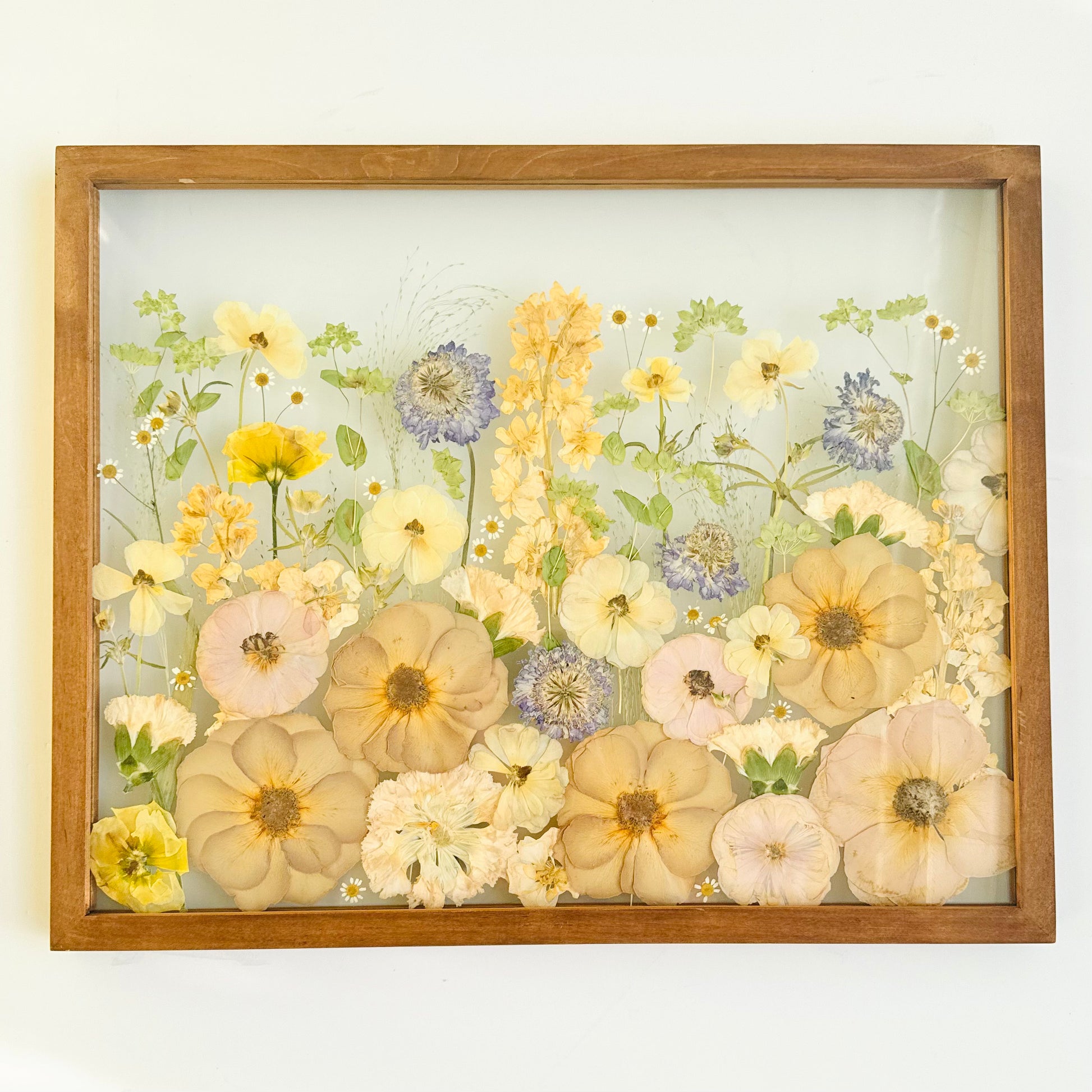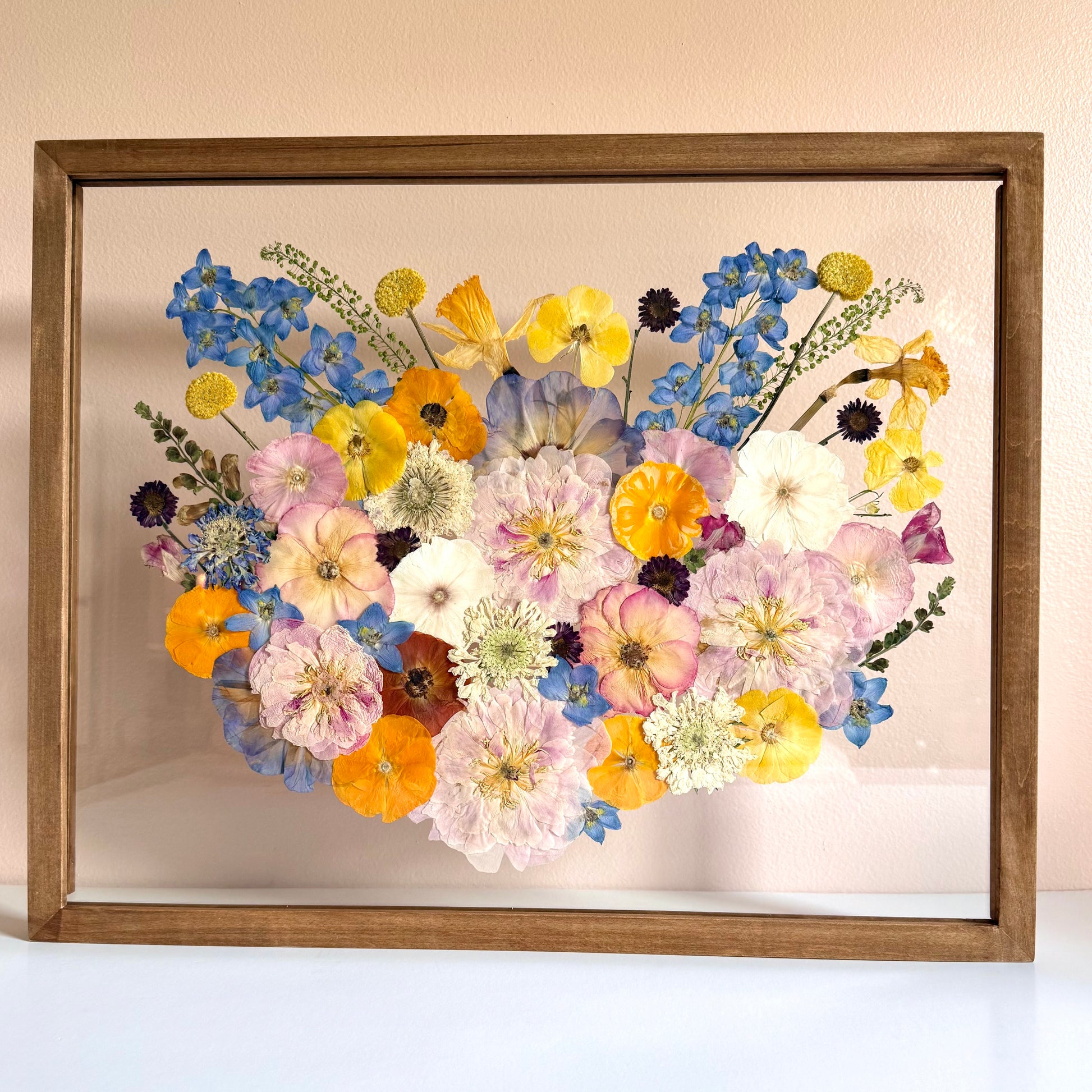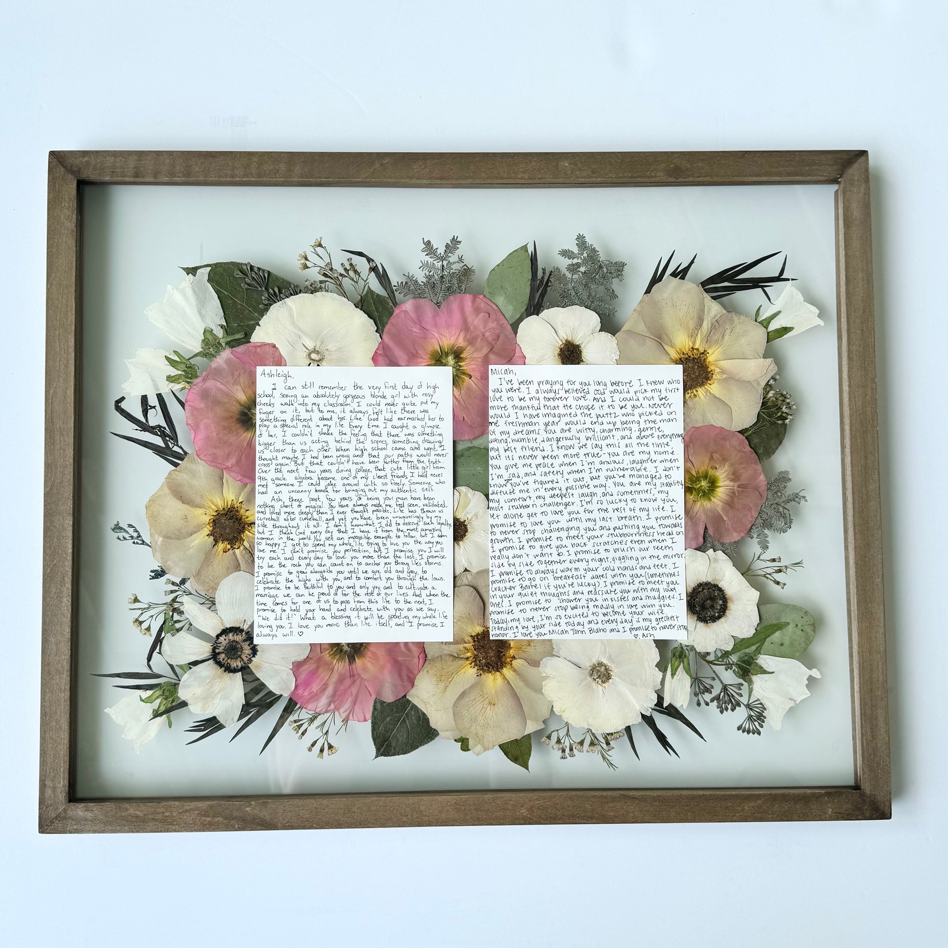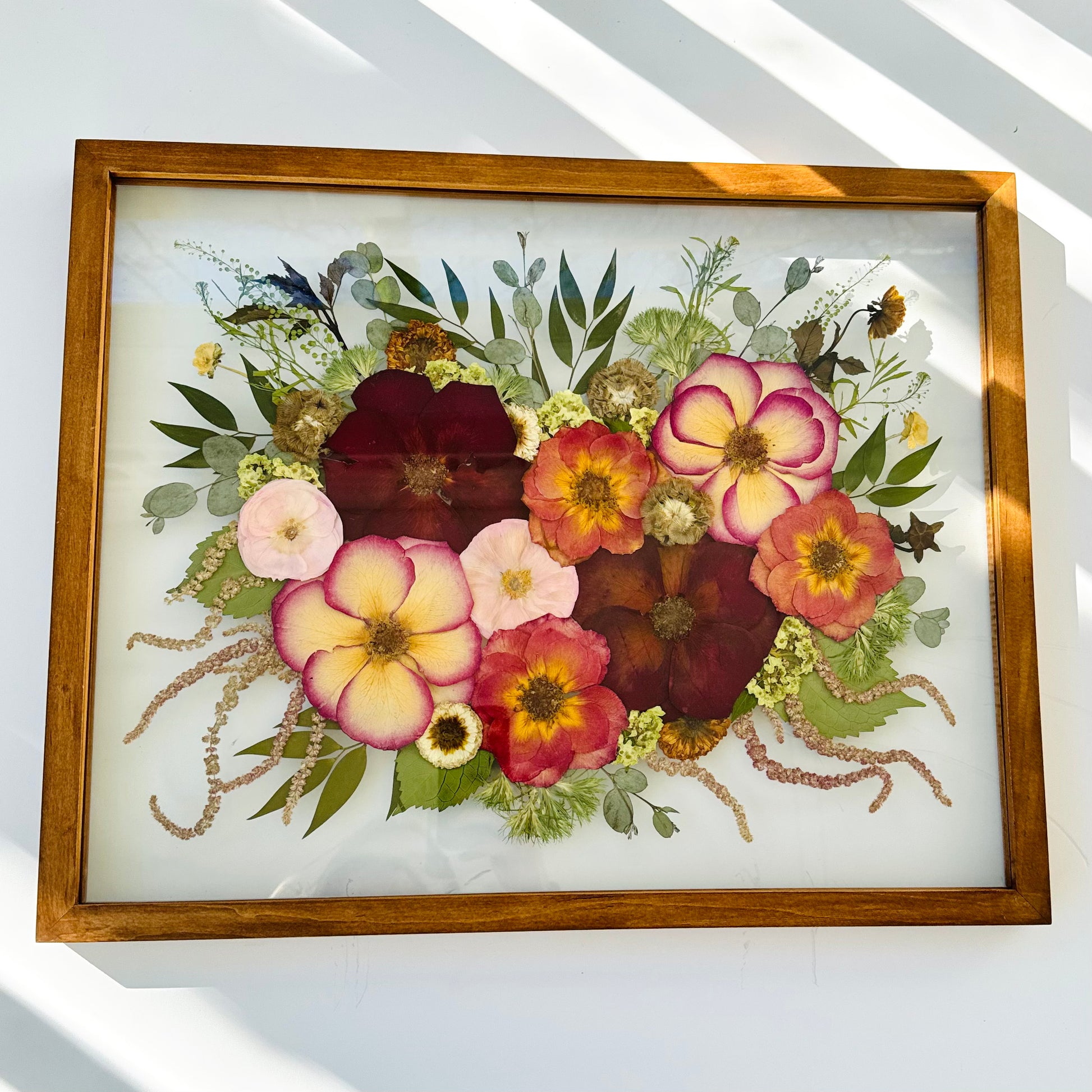 It's completely normal for flowers to change color during the preservation process - white blooms might turn creamy or yellow, and vibrant reds may mellow into purples. We do color-correct white flowers when necessary. This transformation is part of their natural aging process and gives each preserved piece a unique character. We embrace these changes as a testament to nature's unpredictable charm! You will receive a mock-up design for approval and be given the chance to make any adjustments before your frame is finalized.