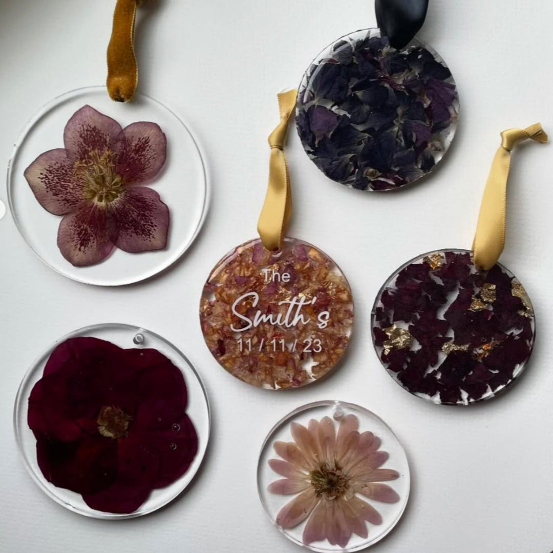 Please note if you would like a specific flower featured in your whole flower ornament, otherwise we will use our judgment to select a flower that fits best (no mockup provided) Ornament flowers must be relatively small (>4", roses will not fit an ornament) and if no flowers fit then your ornament will be done confetti style.
